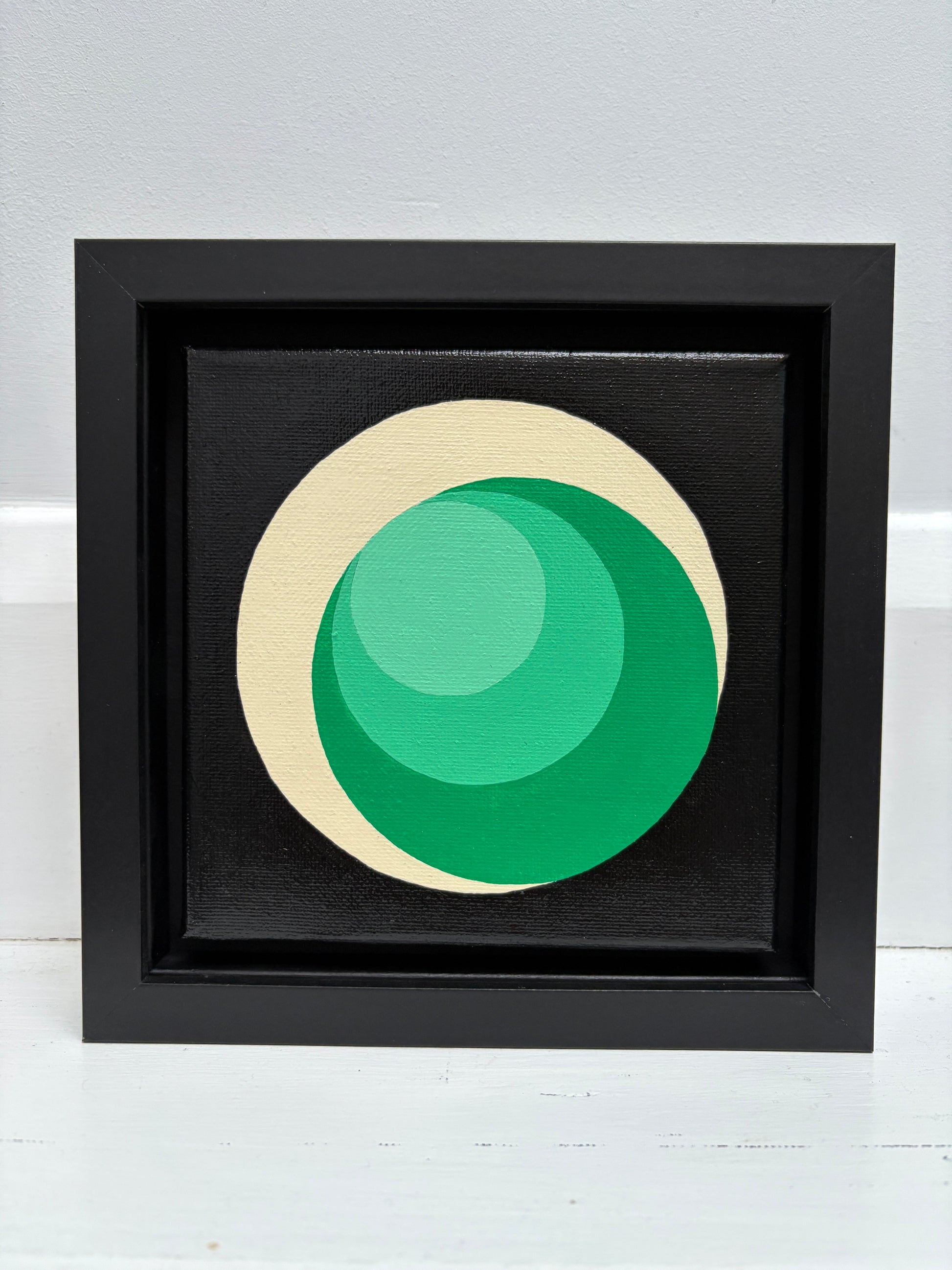 Small, geometric, green original artwork. Would look great on a shelf or mantelpiece or as part of a gallery wall. 15cm canvas recessed in 20cm frame.