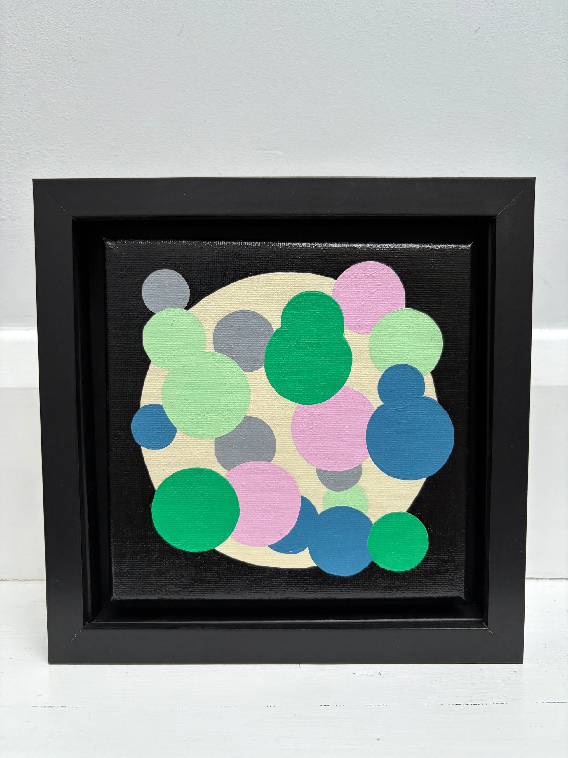 Small blue, pink and green original artwork. Would look great on a shelf or mantelpiece or as part of a gallery wall. 15cm canvas recessed in 20cm frame.