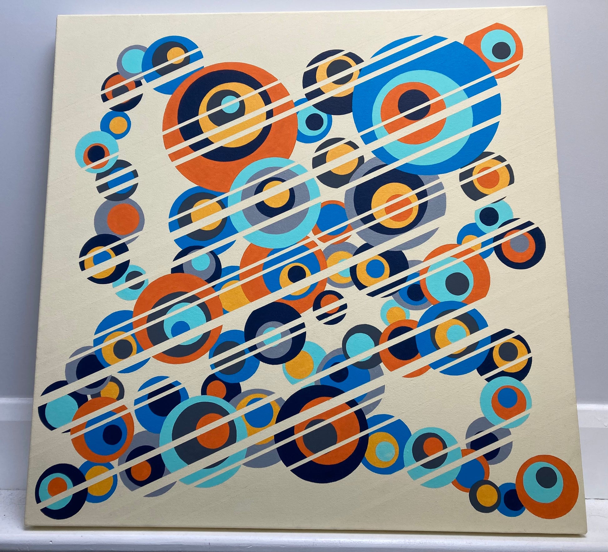 A large, multi-coloured artwork in shades of blue, orange, turquoise and grey to make a real focal point in your space. Part of a pair, this piece would look great on its own or displayed with its partner, 'Talking'. Painted on deep edge 75x75cm canvas with painted edges which makes framing optional but not essential.