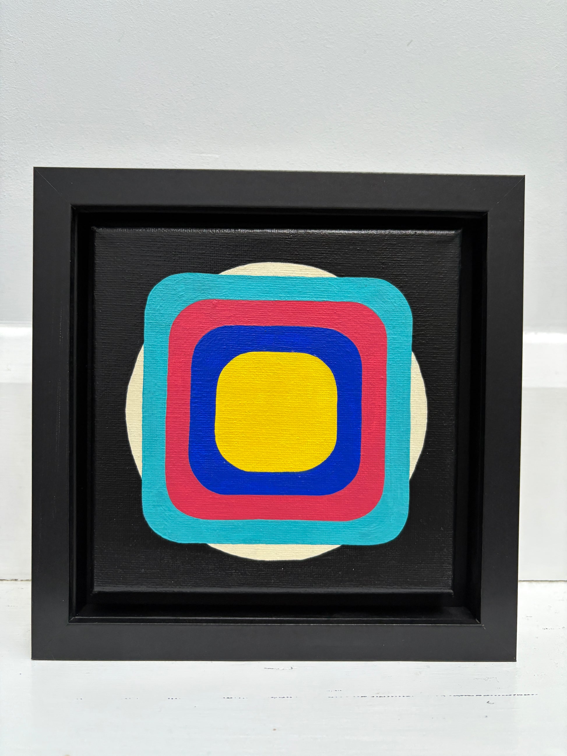 Small geometric yellow, coral and blue original artwork. Would look great on a shelf or mantelpiece or as part of a gallery wall. 15cm canvas recessed in 20cm frame.